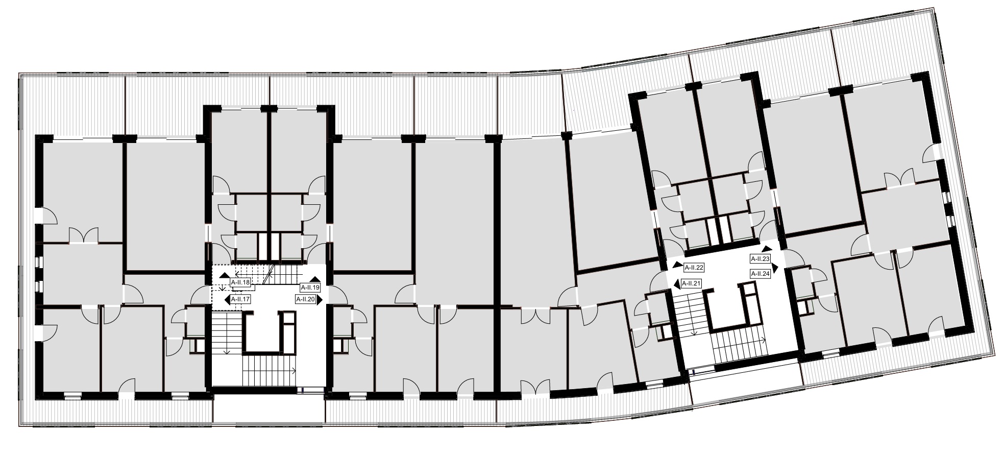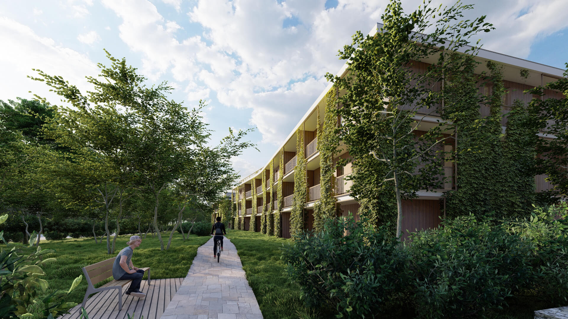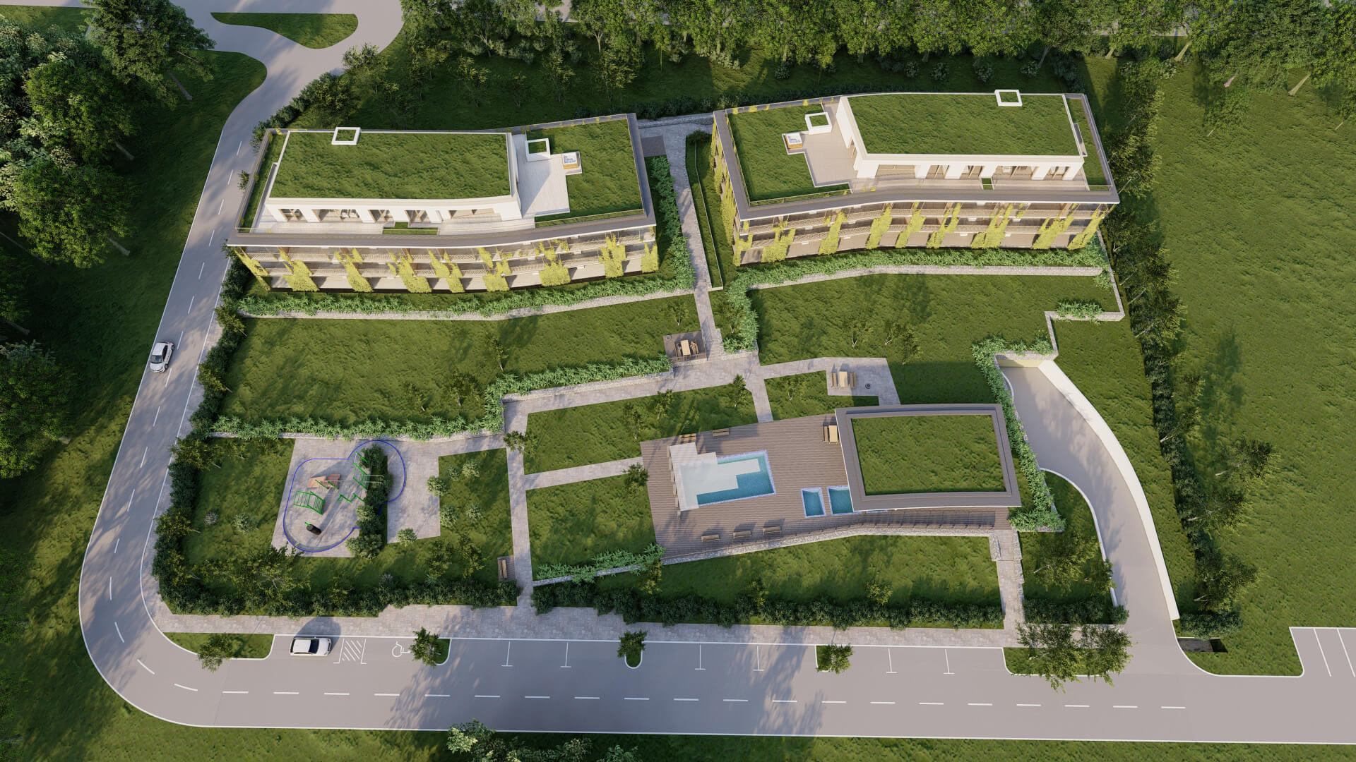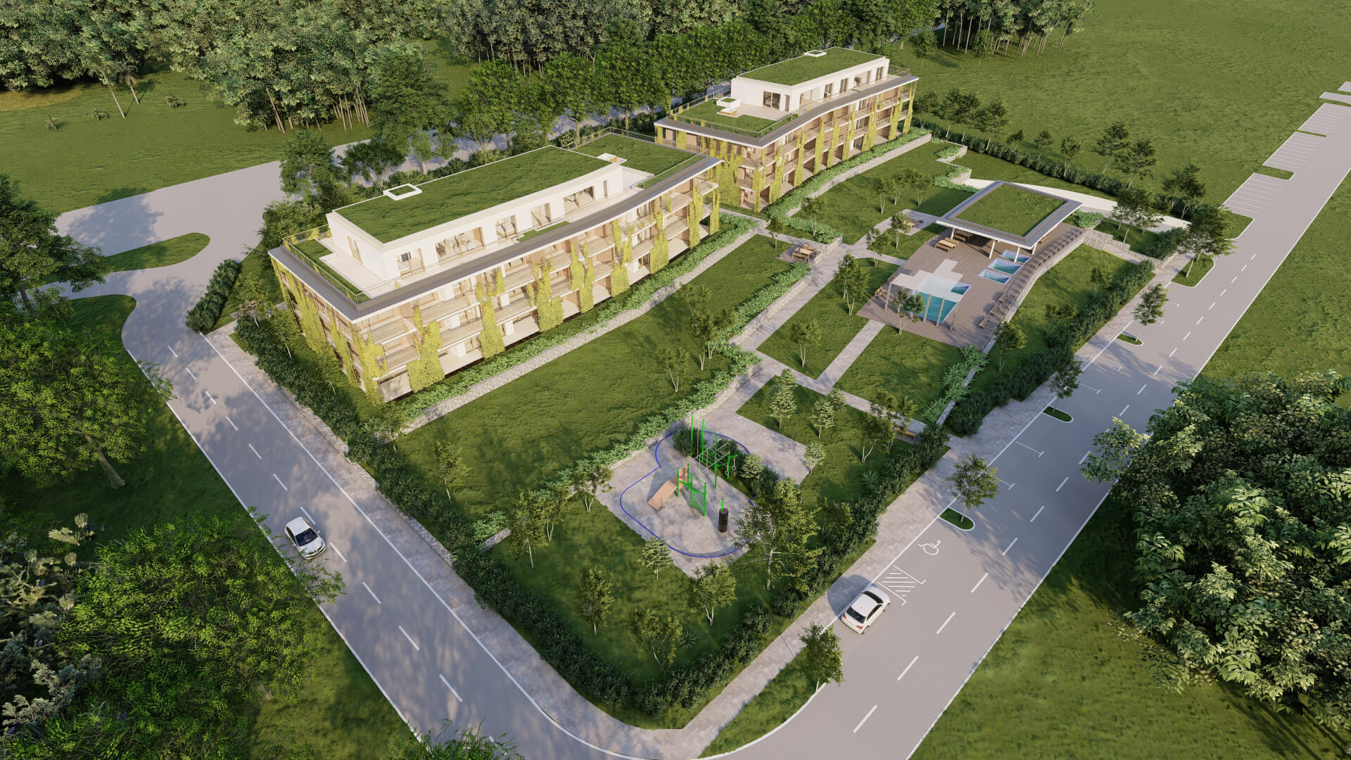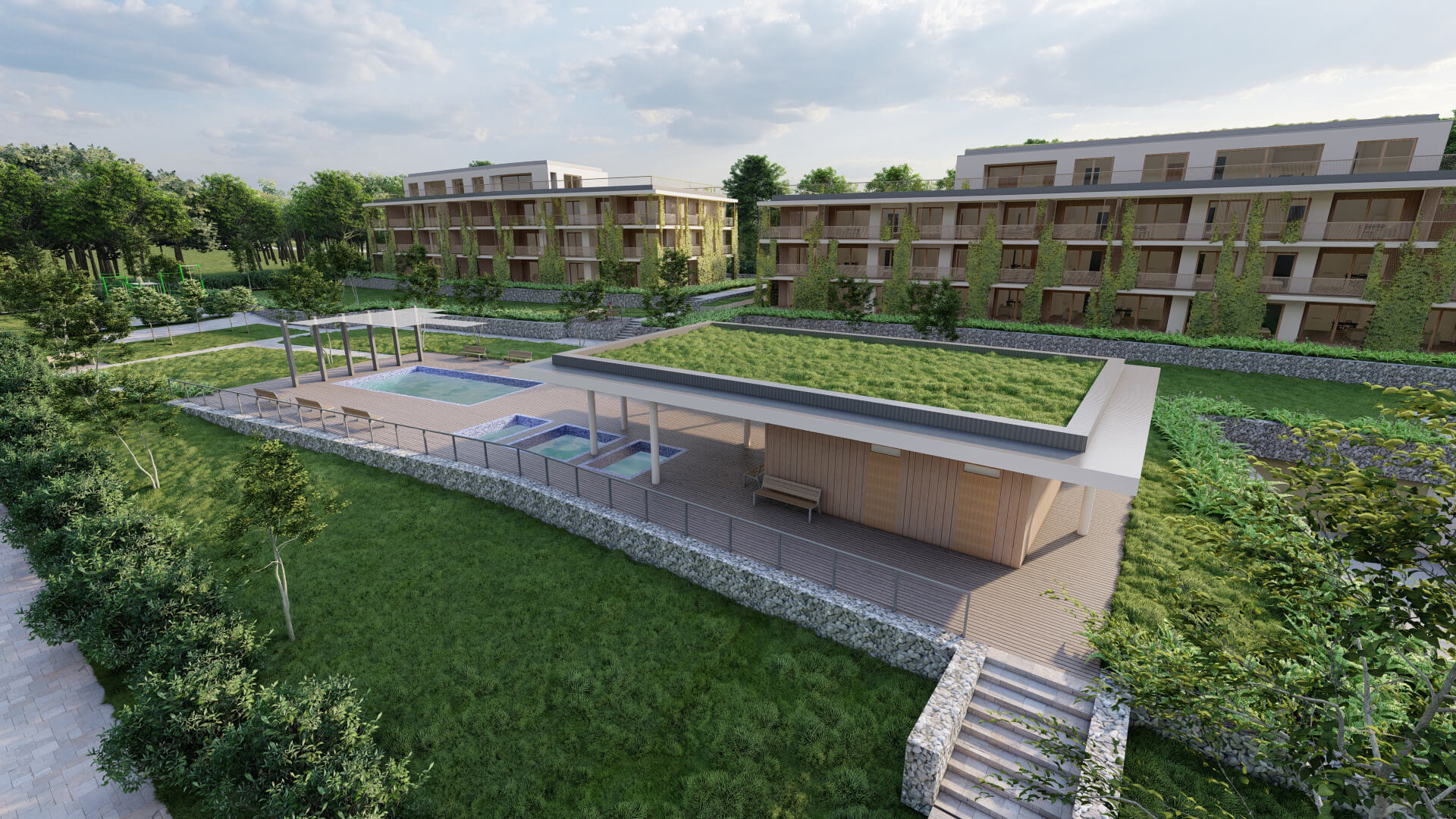 Az újonnan épülő 2×26 lakásos épület tömbök a telek felsőharmadában kerülnek elhelyezésre kitűnő kilátást biztosítva és kihasználva a jelenleg is meglévő közel 4 méteres szint különbséget. Az ingatlan előtt kiépített út- járda és parkolóhelyek készülnek egy oldalról való ki és be közlekedést biztosítva a 7-es út irányába. A tervezett épületeket egy meglévő erdősáv választja el a 7-es úttól. A legmagasabban fekvő tömbtelek révén a már korábban alkalmazott építési rend szerint a beépítés a telek felső részén a határvonallal párhuzamosan összpontosul, garázs szint + földszint + első és második emelet + penthouse szintek alkotta két épületben, amelyeket a legalsó garázs szint köt össze.
