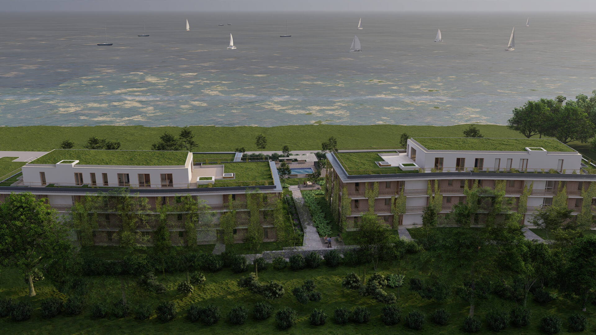 A jellemzően 50 – 70 illetve penthouse szinteken 70-150 nm-es lakóegységeket tartalmazó két társasházi épület szabadon állóan, a Balaton és a táj látványára fókuszálva került telepítésre, fő attrakcióként a tó és a páratlan panoráma felé nyíló akadálytalan kilátással. Épületenként 4 db tágas, világos lépcsőházzal 4 fogatos elrendezéssel szintenként 8, három lakószinten összesen 24 lakóegység található. A penthouse szinten még két lakóhegység található így egy épületben összesen 26 lakás van. Mindkét épület azonos elrendezésű, az alattuk kialakított terem garázs 60 férőhelyes.